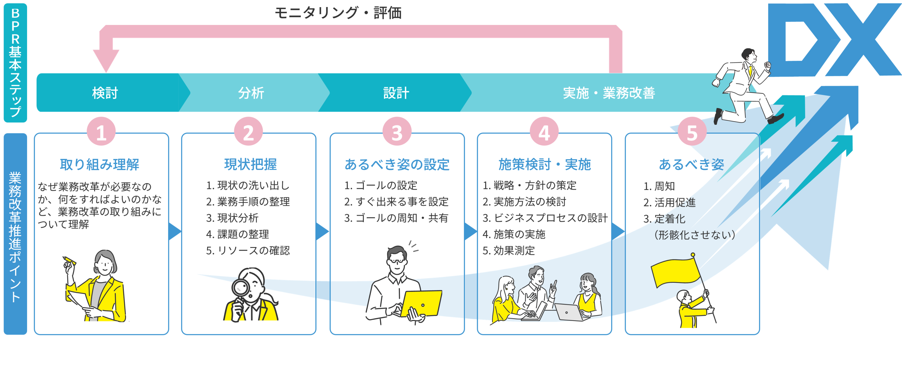 現状把握、業務課題を可視化することで、DXをスムーズに進めるためにどこから手を付ければいいのかという問題が見えてきます。DXに大規模なシステムは必ずしも必要ではありません。システムを導入しなくても、業務プロセスや人員の配置を見直すだけで効率化できる領域もあります。重要なのは、必要な領域に必要な投資を行うことです。