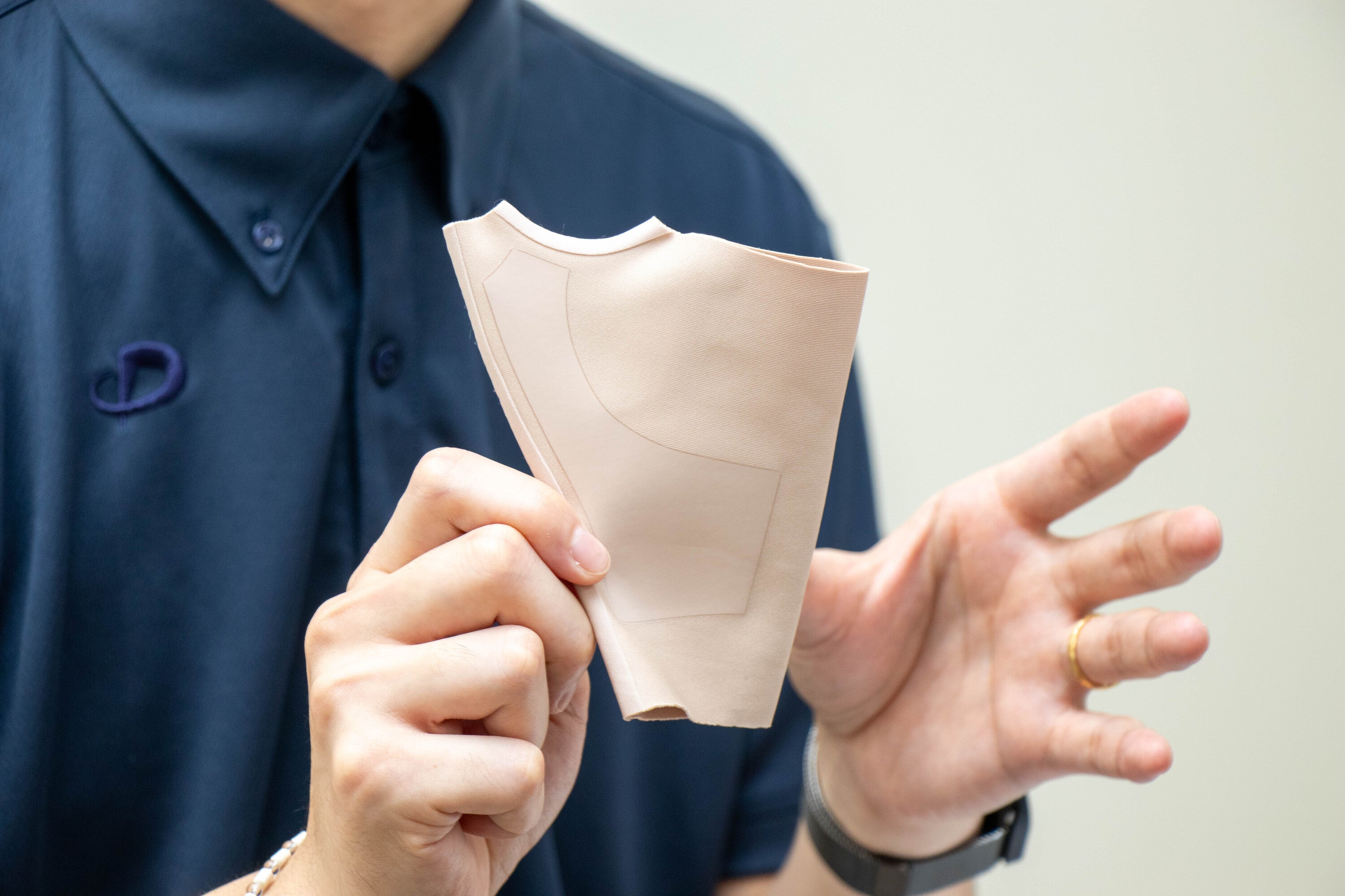 「今回のリニューアルではこれまでの3カテゴリーからソフトタイプ、フィットタイプの2カテゴリーへの展開へと変更しました。2つに絞ることでお客様が悩みに合わせて選びやすくするためです。開発でもっとも苦労したのはフィットタイプのひざ用でした。もとは足を通して装着する筒状のものでしたが、それだと外出先での取り外しができません。しかし、巻く形にすると固定力が弱くなってしまう。結果的に巻くタイプにしつつも柔軟性のある樹脂ステーを内蔵することでサポート力を維持し、素材の三層構造も生かして固定力も備えました。同時に巻くタイプに変更したことで、通気性も維持しています。これは自信作となりました」