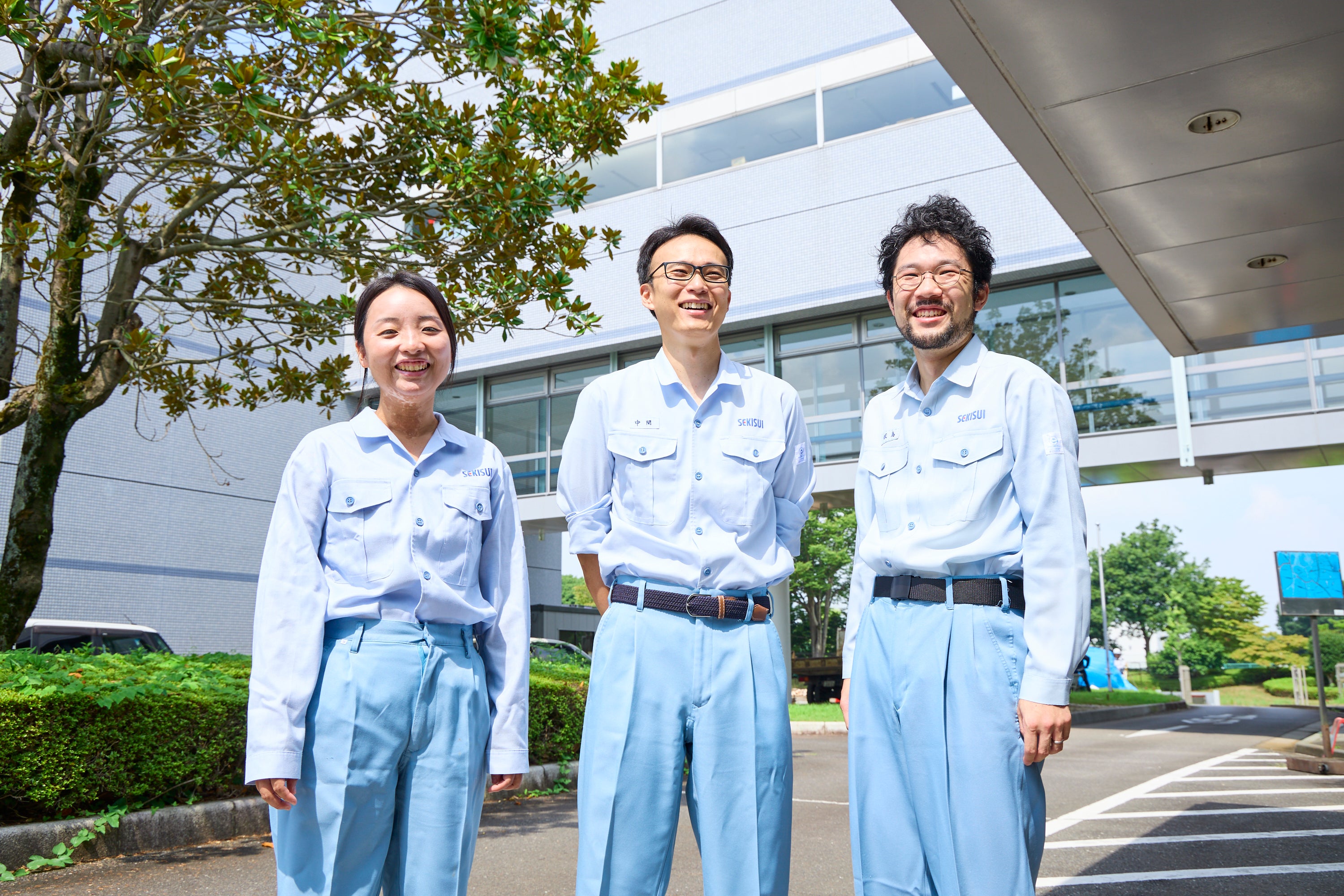 持続可能なビジネスモデルとして、いかにして社会に実装し、価値を創出していくのか。積水化学のR&Dセンターで、CCU技術の開発と実証に挑む研究者たちは、社内外のパートナーと手を携えながら、実用化に向けた一歩を踏み出している。つくば市の研究開発拠点で、未来を見据える3人の言葉に耳を傾けよう。