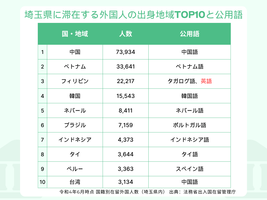 グローバル化に際し、日本人へは英語研修を、外国人材には日本語研修をというのが思いつく方法かと思います。しかし、現在日本で働く外国人国籍の人数ランキングを見てみると、上位10カ国のうち英語が公用語に含まれるのはフィリピン1カ国のみということが分かります。必ずしも英語が外国人材に最適な言語という訳ではありません。