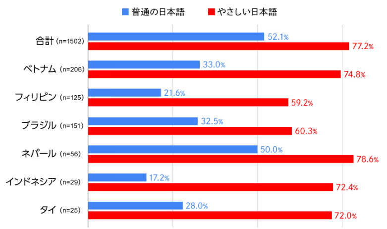 “やさしい日本語”は阪神淡路大震災をきっかけに生まれました。単語や文法を平易にした日本語のことです。入管庁の調査では、アジア諸国やブラジル国籍の方へのやさしい日本語の使用により、理解度が大きく上がったという結果が出ています(図参照)。