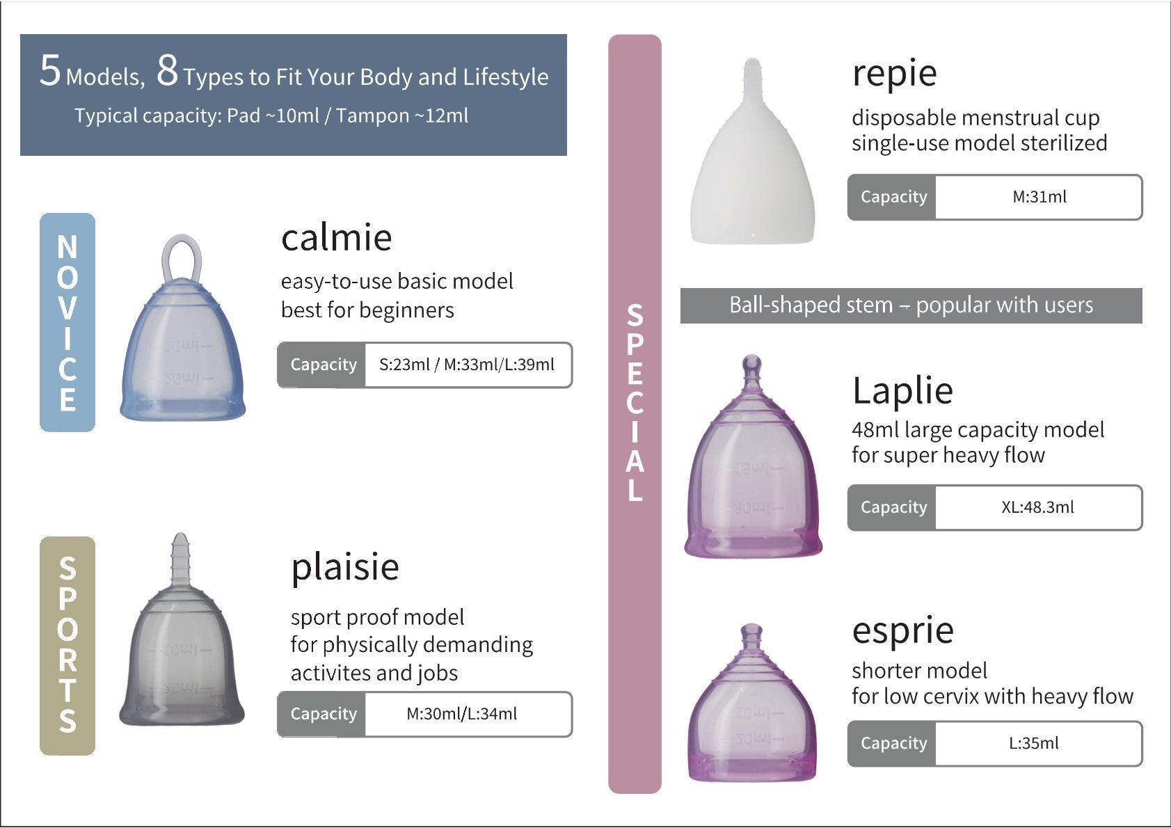 feminakの月経カップは、繰り返し使えるタイプの7種類と、使い捨てタイプの1種類のラインナップを展開しています。ベーシックモデルの「calmie(カルミエ)」、スポーツモデルの「plaisie(プレジエ)」、48ml入る大容量モデル「laplie(ラプリエ)」、低子宮口の方向けに全長が短く設計された「esprie(エスプリエ)」、そして使い捨てタイプの「repie(ルピエ)」があります。