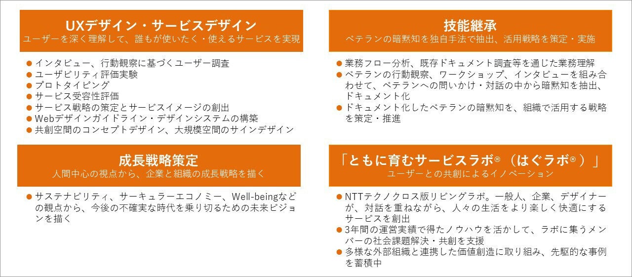 現在、デザイン室では、提供サービスとして「UXデザイン・サービスデザイン」「技能継承」「成長戦略策定」「ともに育むサービスラボ(はぐラボ)」に注力しています。