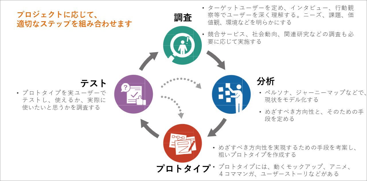 デザイン室の取り組みは、デザイン思考の基本プロセスである「調査(Research)→分析(Analyze)→プロトタイプ(Prototype)→テスト(Test)」を繰り返し、顧客の行動や価値観、取り巻く環境などを理解して課題やニーズを掘り下げていきます。そして、顧客への提供価値を明確にし、最先端の技術も取り入れて、プロトタイピングからテストのサイクルを回しながら解決策の精度を高めていきます。