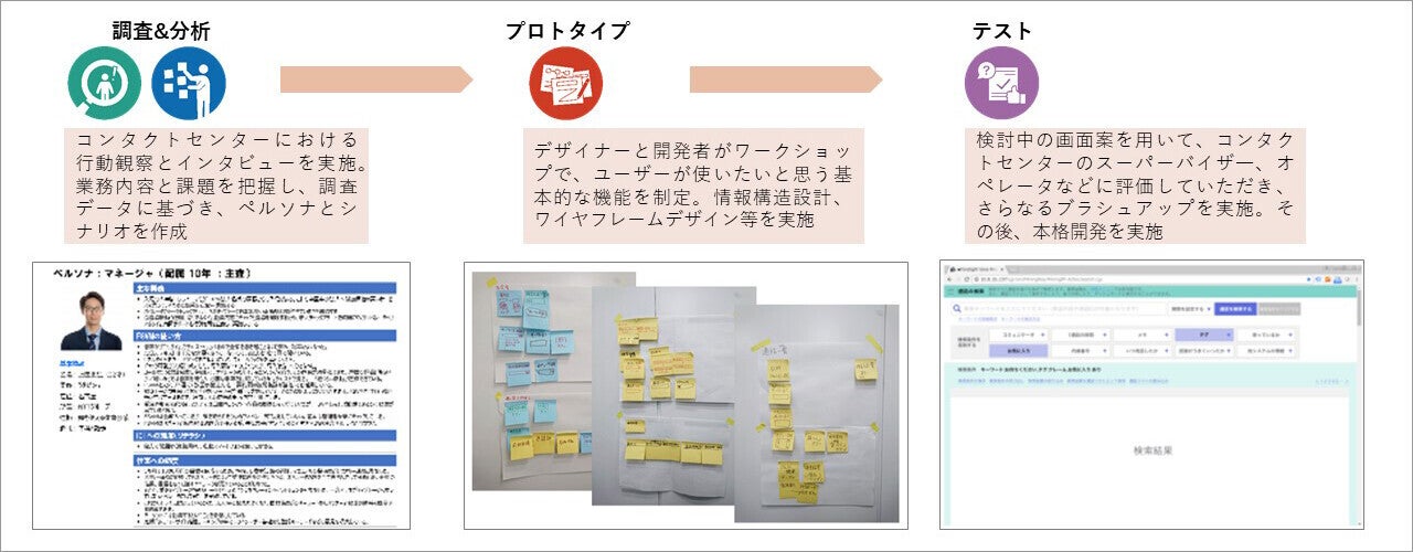 「FSVMはコンタクトセンターの通話音声をリアルタイムで解析し、オペレーターやスーパーバイザーに的確な支援情報を提供するソリューションです。コンタクトセンターの業務オペレーションに関するUXデザインが課題になっていたので、バージョンアップにあたり見直しました。はじめに、現場スタッフの行動観察とインタビューを実施し、その内容を分析して画面デザインと既存システムの利用状況を調査しました。その後、既存システムの画面に対して、現場スタッフに『よく使っているところは○、使っていないところは×、意味が分からないところには?を付けてください』と伝えたところ、『?』の回答が最も多くありました。この調査&分析を受けて、より直感的に使えるインタフェースをめざしてテストを重ねました。その結果を踏まえて生まれたUXデザインは、お客さまからも高く評価され、国内のみならず海外でも採用されています」(大野)