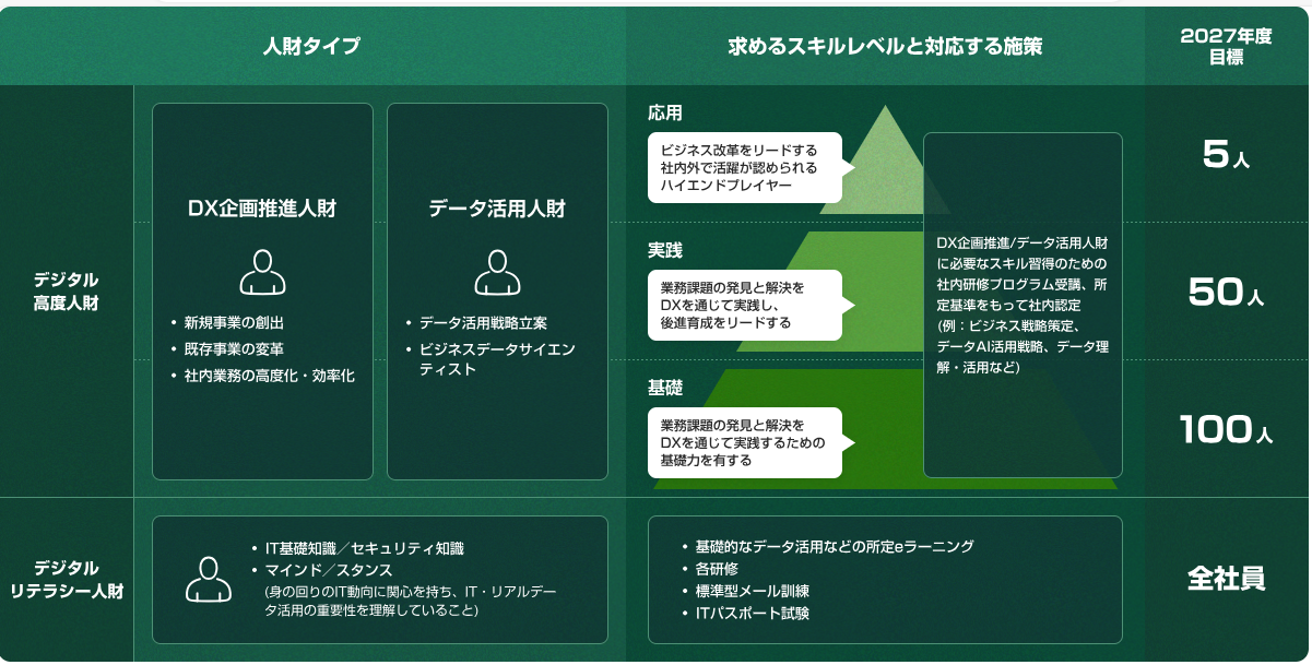 人財タイプは「デジタルリテラシー人財」と「デジタル高度人財」の2つに大別した。前者は、IT・リアルデータ活用のマインドとスタンスや関連する基礎知識の習得を全社員が目指すもの。後者は、住友林業のIT・DXの取り組みを牽引する人財の育成を図るものであるという。
