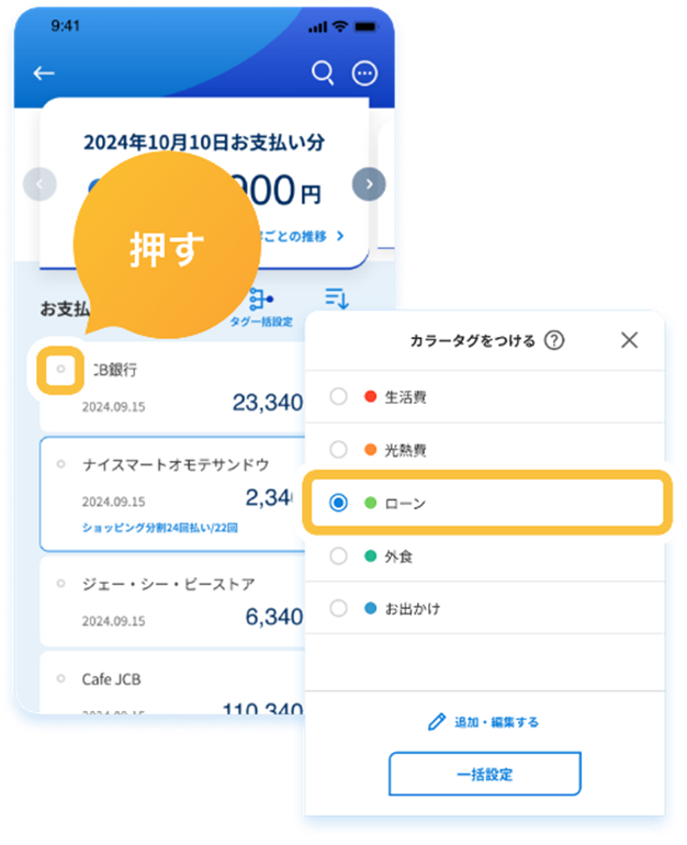JCB 町田さん:先月末に、お支払い明細へタグを付与させることで、分類・集計が直感的に操作できる新機能がリリースされました。自分色で明細を管理できるので、MyJCBアプリ初心者の方にもおすすめです。社内でも一番カード利用が多いお店がどこかの話題で盛り上がってます!是非、支払いの見える化や簡単な家計簿的な使い方をしていただければと思います。