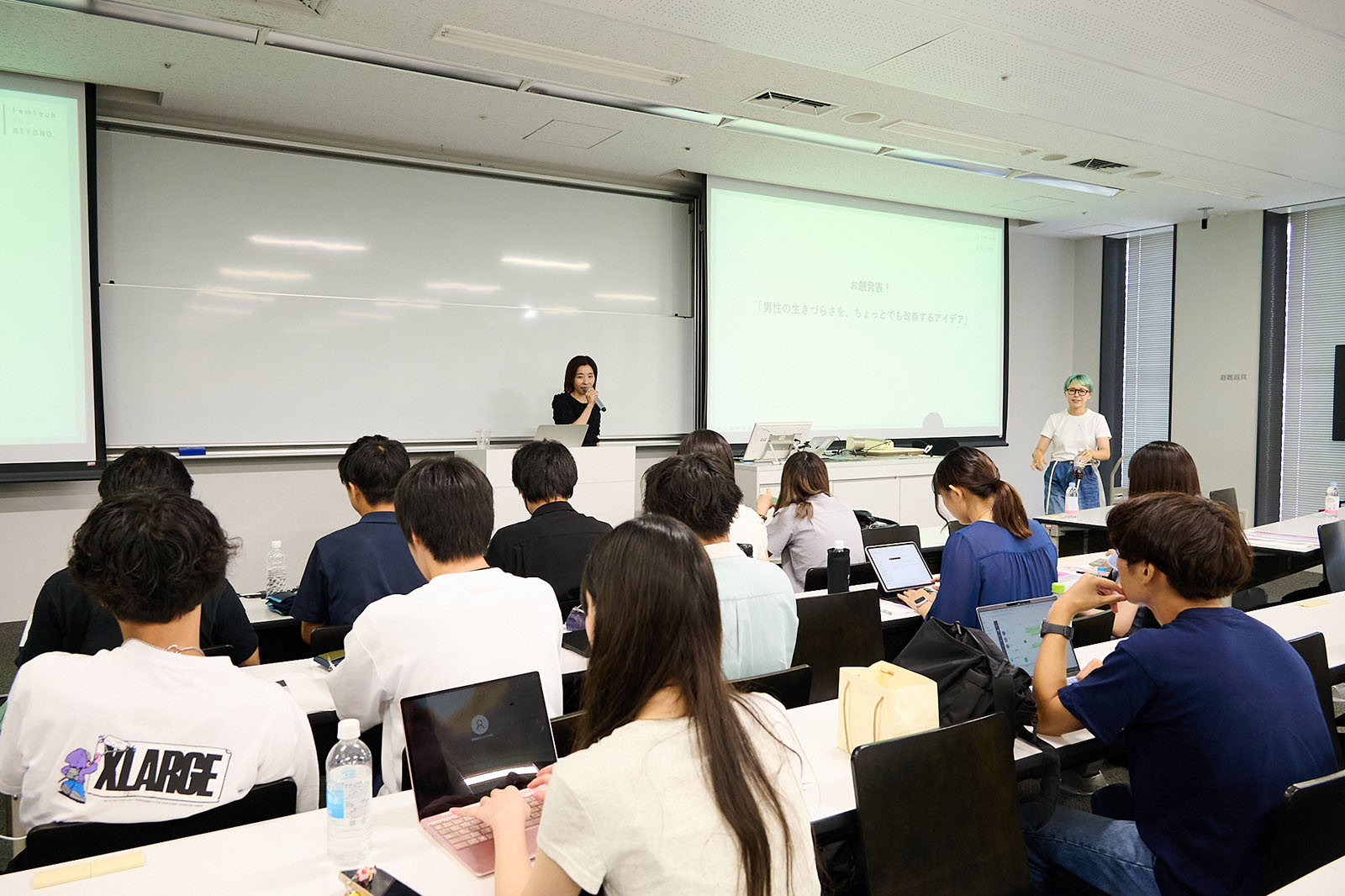 学生の発表を見届けた大重さんは「感情を起点にした課題にはいい意味で共通項がありました。課題から導き出されたのは多様な社会にしていくというゴール。男性の生きづらさを考えると、結局、全員のために良いアイデアになるのだと思います」とコメント。石本さんも今回の講義を振り返って、「自分の違和感や感情に名前をつけて、その感情を冷静に見つめ、人を巻き込んで共感を生むスキルを身に付けてほしい。それが社会を動かす力になります。感情を出発点に社会を変える人になってほしいと思います」と、柔軟な発想力でアイデアを生み出す学生たちにエールを贈りました。